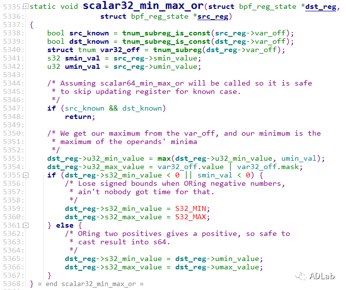 ¸ÃÎó²îºÍPwn2own2020½ÇÖðÖÐʹÓõÄCVE-2020-8835Îó²îÔ­ÀíÒ»Ö£¬£¬£¬£¬¾ùÊǹýʧÅÌËãÁ˼ĴæÆ÷½çÏ߸ú×Ù£¬£¬£¬£¬µ¼Ö¿ÉÒÔÈÆ¹ýÑéÖ¤Æ÷¼ì²éµÖ´ïÔ½½ç¶Áд¡£¡£¡£¡£¡£¡£¡£È±ÏÝ´úÂë·ºÆðÔÚkernel/bpf/verifier.cµÄscalar32_min_max_or()º¯ÊýÖУ¬£¬£¬£¬¸Ãº¯ÊýÊÇÔÚcommit_id£º3f50f132d840ÖÐÒýÈëµÄ£¬£¬£¬£¬¸Ã¹¦Ð§ÊµÏÖÁËÏÔʽµÄALU32(32λÅÌËãÀà²Ù×÷)¼Ä´æÆ÷½çÏ߸ú×Ù£¬£¬£¬£¬´¦Öóͷ£ORÔËËãʱ£¬£¬£¬£¬Å²ÓÃscalar32_min_max_or()º¯Êý¾ÙÐÐ32λ¼Ä´æÆ÷½çÏ߸ú×Ù£¬£¬£¬£¬¸Ãº¯ÊýʵÏÖÈçÏ£º