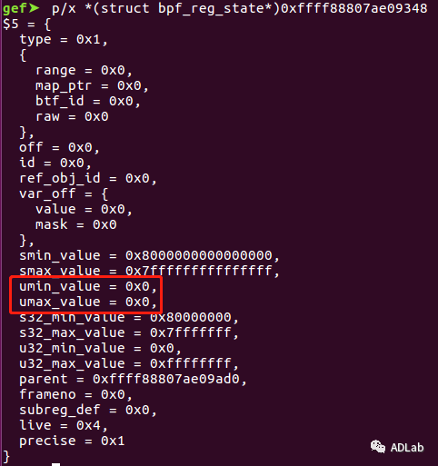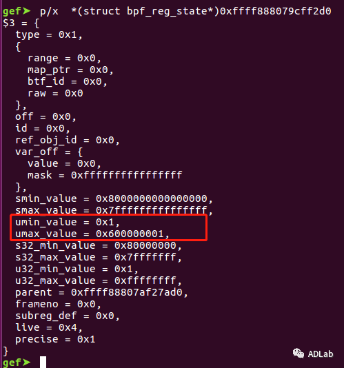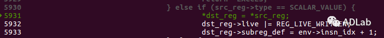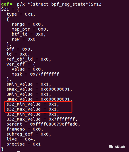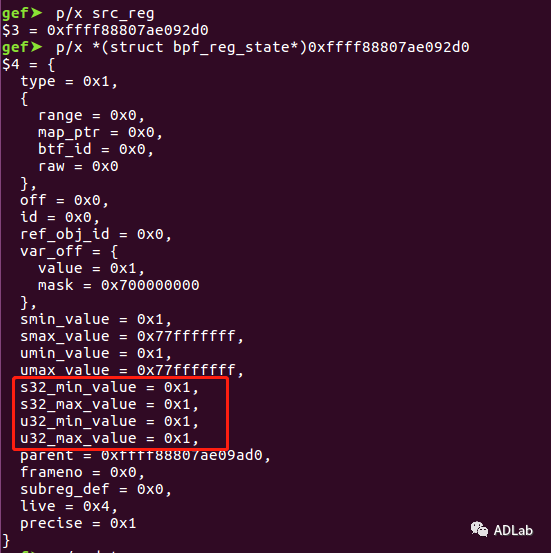 ÐÐ5365ºÍÐÐ5366£¬£¬£¬£¬Ö±½Ó½«dst_reg¼Ä´æÆ÷ÖеÄ64λÎÞ·ûºÅÖµ¸³Öµ¸ø32λÓзûºÅÖµ£¬£¬£¬£¬ÕâÏÔ×ÅÊǹýʧµÄ¡£¡£¡£¡£¡£¡£¡£ÀýÈçÉèÖÃdst_reg->umin_value=1£¬£¬£¬£¬dst_reg->umax_value=0x600000001£¬£¬£¬£¬µ±¾ÙÐÐÈçÉϲÙ×÷ºó£¬£¬£¬£¬dst_reg->s32_min_valueΪ1£¬£¬£¬£¬¿ÉÊÇdst_reg->s32_max_valueÒ²½«ÊÇ1£¬£¬£¬£¬ÓÉÓÚ0x600000001µÄ¸ß뽫±»½Ø¶Ï£¬£¬£¬£¬Õâʱdst_reg¼Ä´æÆ÷µÄ¹æÄ£´Ó[1,0x600000001]Äð³ÉÁË[1,1]£¬£¬£¬£¬Õâ»á±»ÑéÖ¤Æ÷ʶ±ðΪ³£Êý1£¬£¬£¬£¬½ø¶øÈƹýÑéÖ¤Æ÷¼ì²é¡£¡£¡£¡£¡£¡£¡£Îó²î²¹¶¡ÖУ¬£¬£¬£¬¾ÙÐÐÁË׼ȷµÄ32λÓзûºÅÖµ¸³Öµ²Ù×÷£¬£¬£¬£¬ÈçÏÂËùʾ£º