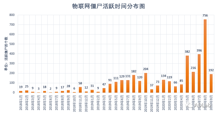 ÎÒÃǶÔÕâЩÑù±¾µÄ»îÔ¾ÊýÄ¿ºÍ»îԾʱ¼ä¾ÙÐйØÁªÍ³¼Æ£¬£¬£¬£¬£¬£¬»æÖÆÁËÎïÁªÍø½©Ê¬»îԾʱ¼äÂþÑÜͼ£¬£¬£¬£¬£¬£¬¼ûͼ6¡£¡£¡£¡£´ÓÕâÅúÑù±¾µÄ¹¥»÷ʱ¼äÀ´¿´£¬£¬£¬£¬£¬£¬ÖÁÉÙ´Ó2018Äê1ÔÂ×îÏÈ£¬£¬£¬£¬£¬£¬¹¥»÷Õß¾Í×îÏÈʹÓÃGafgyt¡¢Mirai×齨ÎïÁªÍø½©Ê¬ÍøÂ磬£¬£¬£¬£¬£¬È»ºóʹÓÃ×齨ºÃµÄ½©Ê¬ÍøÂç¾ÙÐÐDDoS¹¥»÷IJÀû¡£¡£¡£¡£2019Äê3Ô¹¥»÷×îÏÈ»îÔ¾£¬£¬£¬£¬£¬£¬2019Äê10Ô·ºÆðÁËÒ»¸öСá¯Á룬£¬£¬£¬£¬£¬¹¥»÷µÄ×îá¯ÁëÔò·ºÆðÔÚ2020Äê8Ô¡£¡£¡£¡£