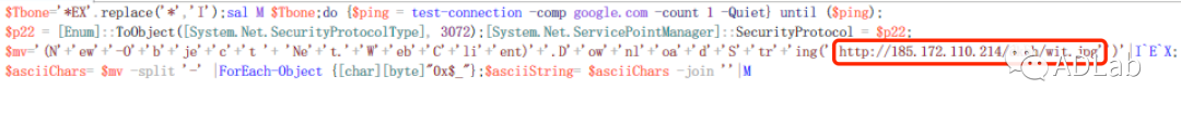 VBSÎļþ¾ÓÉ×Ö·ûÈ¥»ìÏýºÍ´úÂë½âÃÜ£¬£¬£¬£¬£¬£¬×îÖÕÖ´ÐеÄPowershell¼ûͼ24£¬£¬£¬£¬£¬£¬ÎÒÃÇ¿ÉÒÔ¿´µ½Õâ¶ÎPowershellÒ²ÊÇÒ»¸öÏÂÔØÆ÷¡£¡£¡£¡£ÆäÏÈÊÇʹÓÃping google.comµÄ·½·¨È·¶¨×ÔÉíËùÔÚµÄÊÜѬȾÖ÷ÐÔÄܹ»Õý³£ÁªÍø£¬£¬£¬£¬£¬£¬È»ºóŲÓÃNet.WebClient.DownloadStringº¯Êý´ÓÔ¶³ÌЧÀÍÆ÷¡°http://185.172.110.214/dkhh/wit.jpg¡±ÉÏÏÂÔØÒ»¸öÃûΪ¡°wit.jpg¡±µÄÎļþ¡£¡£¡£¡£
