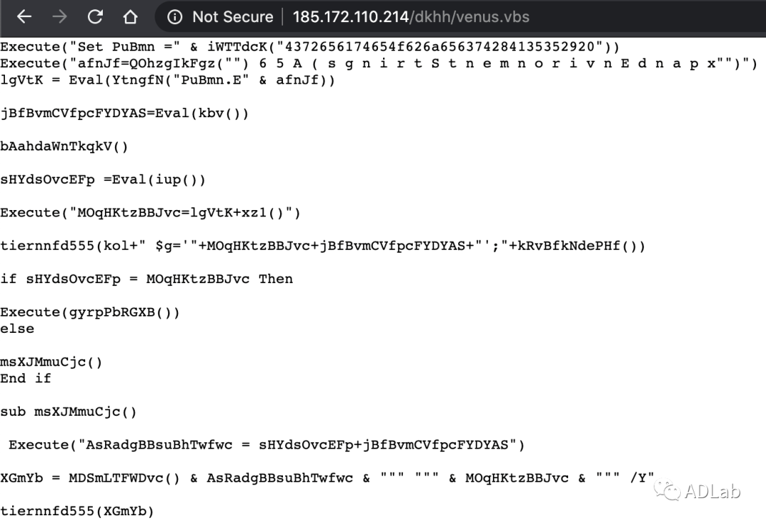 ×îºóÖ´ÐеĶñÒâ´úÂëÊÇͼ21ËùʾµÄÒ»¸öPowershell¾ç±¾£¬£¬£¬£¬£¬£¬²»¹ý¸Ã¾ç±¾Ö´ÐеÄÏÂÁî×öÁË×Ö·û»ìÏý´¦Öóͷ£¡£¡£¡£¡£¾ç±¾ÔÚÖ´ÐÐʱÏÈÊǽ«»ìÏý¹ýµÄ×Ö·û´®×ª»»³É×Ö·ûÊý×飬£¬£¬£¬£¬£¬È»ºóŲÓÃReverseº¯ÊýÄæÐòÅÅÁиÃ×Ö·ûÊý×飬£¬£¬£¬£¬£¬ÔÙ½«ÄæÐòºóµÄ×Ö·ûÊý×鯴½Ó³É×Ö·û´®£¬£¬£¬£¬£¬£¬ºóÃæµÄ²Ù×÷Êǽ«×Ö·û´®ÖеÄÌî³ä×Ö·û¡®&¡¯È¥µôÔÙת»¯³É16½øÖƱàÂë¡£¡£¡£¡£¾ÓÉÕâÑùµÄ¼¸²½´¦Öóͷ££¬£¬£¬£¬£¬£¬Ö´ÐÐÏÂÁî¾Í±»»¹Ô³öÀ´ÁË£¨¼ûͼ22£©£¬£¬£¬£¬£¬£¬´Óͼ22ÖÐÎÒÃÇ¿ÉÒÔ¿´µ½¸ÃPowershell¾ç±¾ÏÖʵÉÏÊÇÒ»¸öÏÂÔØÆ÷£¬£¬£¬£¬£¬£¬Ëü»á´ÓÔ¶³ÌЧÀÍÆ÷http://185.172.110.214/dkhh/venus.vbsÉÏÏÂÔØÒ»¸öVBSÎļþÀ´Ö´ÐС£¡£¡£¡£