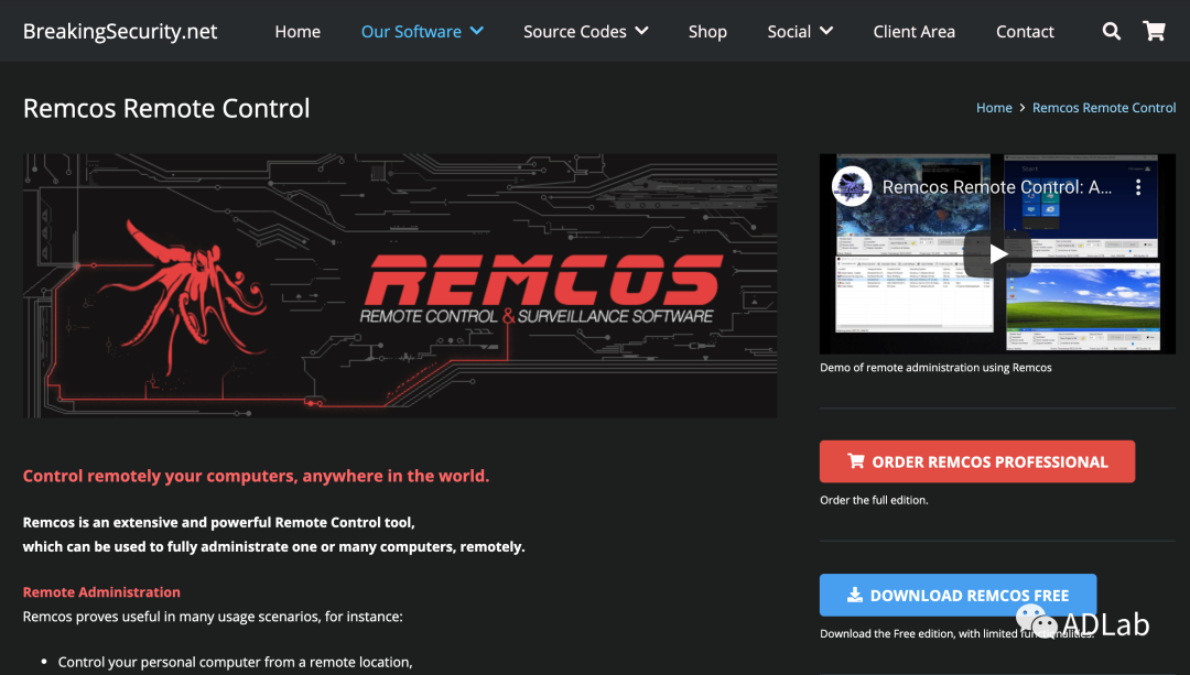 ×Ô2016ÄêÔÚ°µÍøÉϵĵØÏºڿÍÉçÇø×îÏȳöÊÛÒÔÀ´£¬£¬£¬£¬£¬£¬Remcos RAT·Ç³£»£»£»£»£»£»£»îÔ¾£¬£¬£¬£¬£¬£¬»ù±¾ÉÏÿ¸öÔ¶¼»áÐû²¼Á½¸ö×óÓÒµÄа汾¡£¡£¡£¡£Æä¾ßÓмüÅ̼ͼ¡¢ÆÁÄ»¼Í¼¡¢Å²ÓÃÉãÏñÍ·ºÍÂó¿Ë·ç¾ÙÐмÏñ¼Òô¡¢Ô¶³ÌÖ´ÐÐShellÏÂÁî¡¢Ô¶³ÌÖ´Ðо籾¡¢ÉÏ´«ÎļþÒÔ¼°ÏÂÔØÎļþµÈ¹¦Ð§¡£¡£¡£¡£¸Ã¹¤¾ßÓÉÒ»¼ÒÃûΪBreakingSecurityµÄ¹«Ë¾¿¯ÐгöÊÛ£¬£¬£¬£¬£¬£¬Í¼27ÊÇRemcos RATµÄ¹ÙÍø½çÃæ¡£¡£¡£¡£Í¨¹ý¹ûÕæµÄÐÅÏ¢¿ÉÒÔ·¢Ã÷£¬£¬£¬£¬£¬£¬ÆäÒѱ»ºÚ¿ÍƵÈÔµØÊ¹ÓÃÔÚÖÖÖÖ¹¥»÷»î¶¯ÖС£¡£¡£¡£